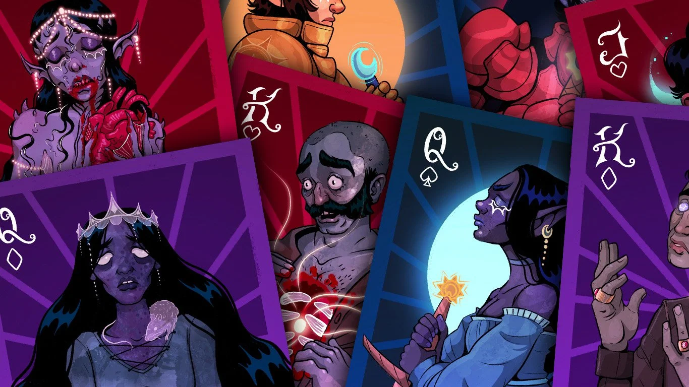 An illustrated playing card deck inspired by dark folklore, tragic love and haunting transformations.